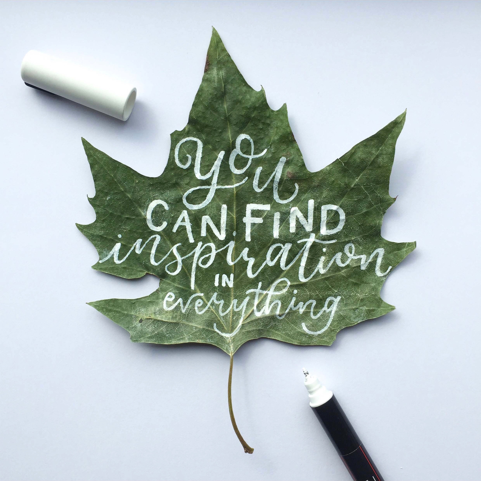 An inspiring quote handlettered onto a fallen leaf using a white Posca paint marker.